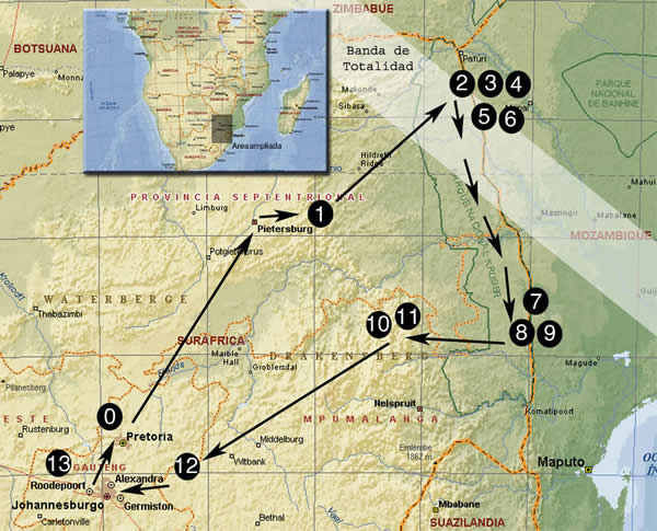 * Día 1 (1 diciembre): Tzaneen a 40 km de Pietersburg. * Días 2 al 6 (2-6 diciembre): Llegada al punto previsto para la observación en Shingwedzi (4 diciembre, hora eclipse 6:21 UT, duración 1 minuto 26 segundos). Exploración de alrededores y zona norte del parque. * Días 7 al 9 (7-9 diciembre): Filmaciones en zona sur del Parque Nacional de Kruger, uno de los siete santuarios del mundo que alberga la mayor concentración de mamíferos del planeta. Sus 19.485 kilómetros cuadrados ofrecen refugio a 147 especies de mamíferos entre el rinoceronte blanco. * Días 10 al 11 (10-11 diciembre): Filmaciones en el incomparable Blyde River Canyon. * Día 12 (12 diciembre): Johannesburgo. La expedición Shelios 2002 tiene como principal objetivo observar el eclipse total de Sol que se producirá el próximo día 4 de diciembre de 2002. El fenómeno que comenzará en el Atlántico Sur, atravesará el cono sur de África (Namibia, Zambia, Zimbabwe, Bostwana, Sudáfrica y Mozambique), llegando a su máximo en el océano Pacífico (39º 28" S y 59º 33" E) para morir en la costa suroccidental de Australia. Este proyecto combina la ciencia con la aventura, al igual que el resto de las anteriores expediciones de Shelios. Con dicho fin se ha creado este portal web (www.shelios.com/sh2002) donde podrás encontrar información sobre los eclipses de Sol y su importancia científica y durante la expedición, imágenes y relatos del viaje.