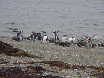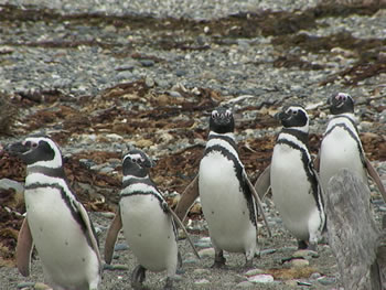 Imagen 1. La pingüinera de Seno Otway. (Foto Luis Cuesta) Imagen 2. Varios miembros de una familia de pingüinos magallánicos se dirgen a sus nidos después de pescar. (Foto Héctor Vicente)