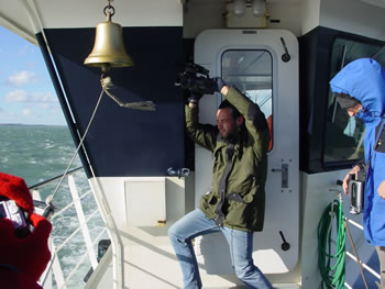 Imagen 2. Héctor lucha contra el fortísimo viento del Estrecho de Magallanes durante la travesía en la barcaza. (Foto Gloria Checa)